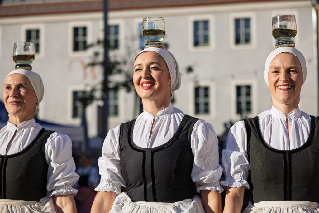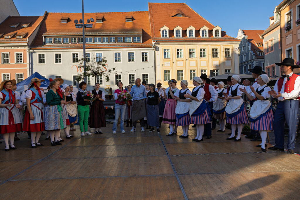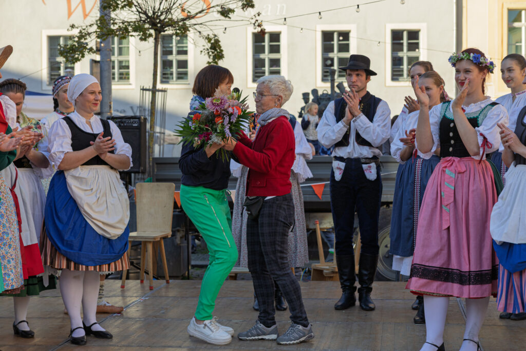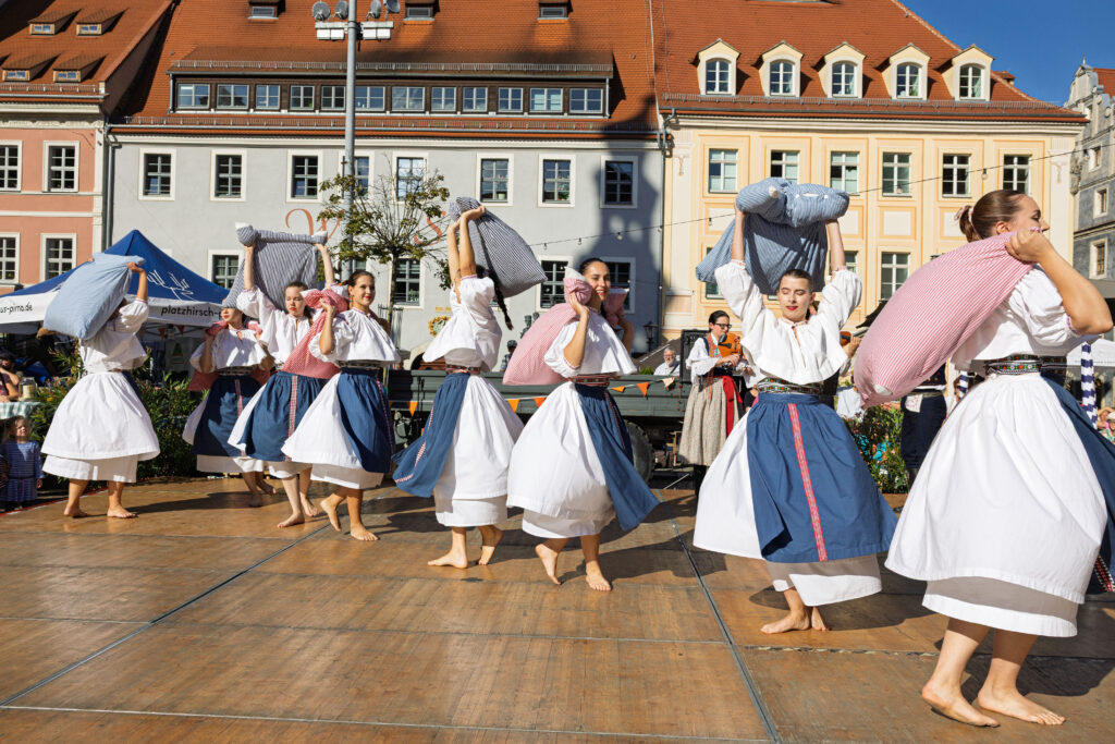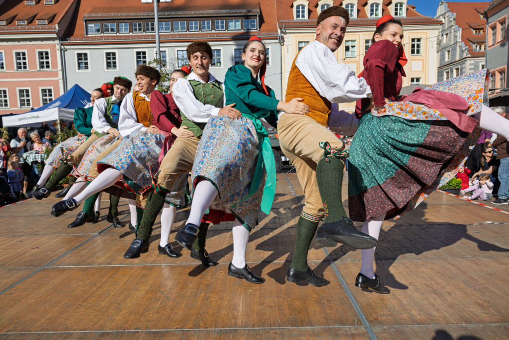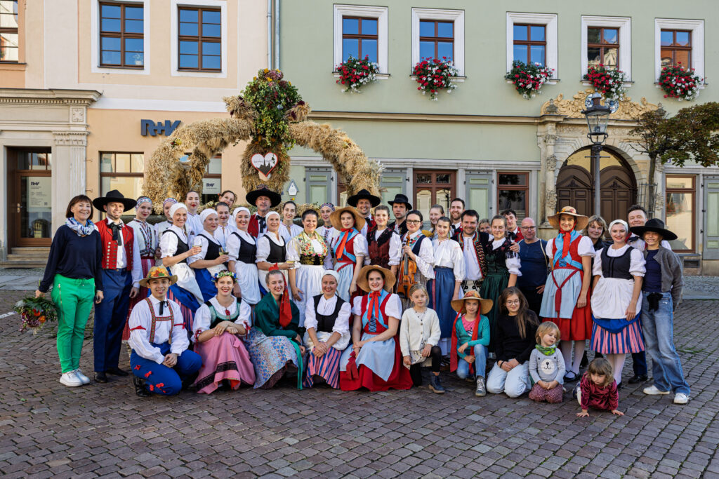Am 28.09.2025 feierte die Stadt Pirna das Erntedankfest. Das Folkloretanzensemble “Thea Maass” der TU Dresden wurde eingeladen, um die Feier lebendiger und bunter zu gestalten. Außerdem kam das Folkloreensemble Rosenka – Gruppe Hrozenka (FS Rosenka skupina Hrozenka) aus Prag zu Gast.
