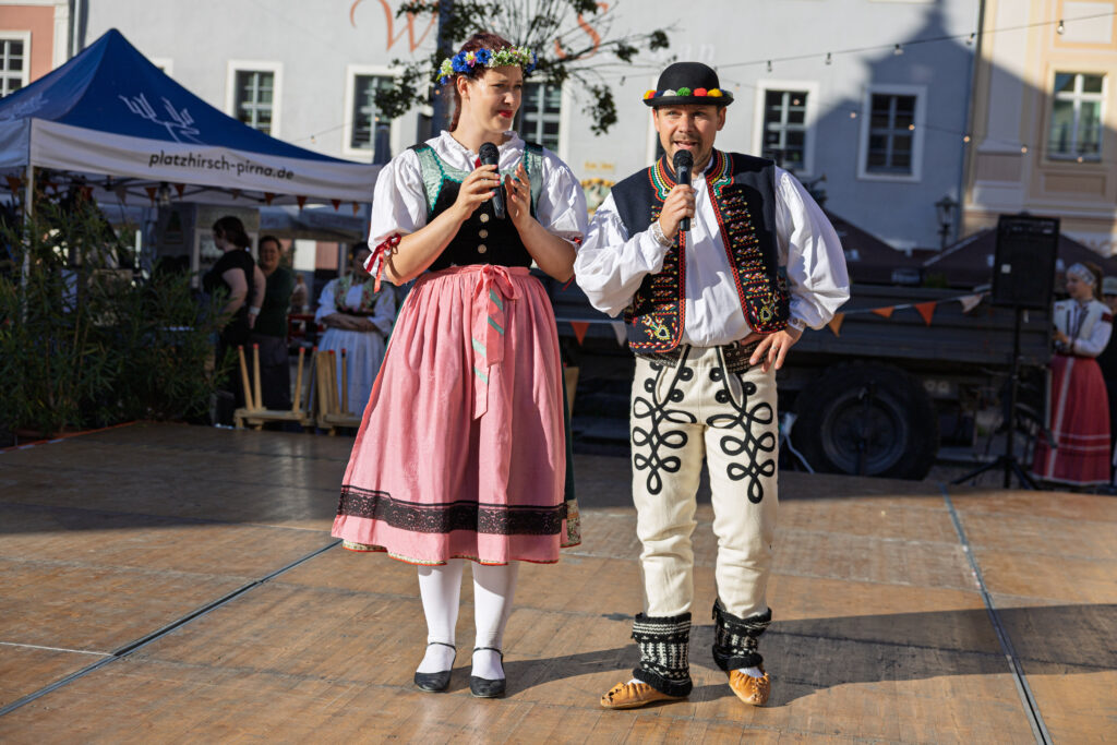 Auf dem Pirnaer Marktplatz wurde eine schöne Bühne für unsere Tänze aufgebaut. Schon um 15 Uhr begannen wir mit dem Rühler Springer. Nach unserem Dreisteyrer traten die Prager mit ihrem süßen Kissentanz und dem Verbuňk, einem südmährischen Tanz zur Anwerbung von Rekruten, auf.
